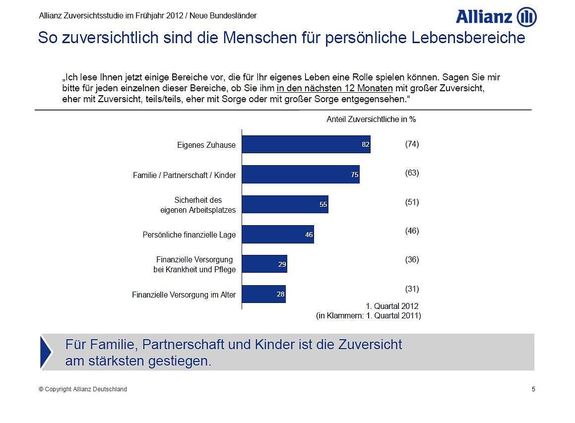 In den Neuen Bundesländern ist die Euphorie der Wendejahre längst einer realistischen Einschätzung der Zukunftsperspektiven Deutschlands gewichen: Die Menschen lassen sich weder vom deutschen Jobwunder, steigenden Steuereinnahmen oder positiven Konjunkturerwartungen blenden, noch drücken die allgegenwärtige Schulden- und Vertrauenskrise, die Wulff-Affäre oder die Schlecker-Insolvenz mit Vehemenz aufs ostdeutsche Gemüt, sagt Professor Frank Brettschneider von der Universität Hohenheim, der die Allianz Zuversichtsstudie wissenschaftlich betreut. Von dieser Warte aus lässt sich erklären, warum der Osten der Republik bundesweit die einzige Region mit einem nahezu konstanten Zuversichtswert für die Entwicklung Deutschlands ist.