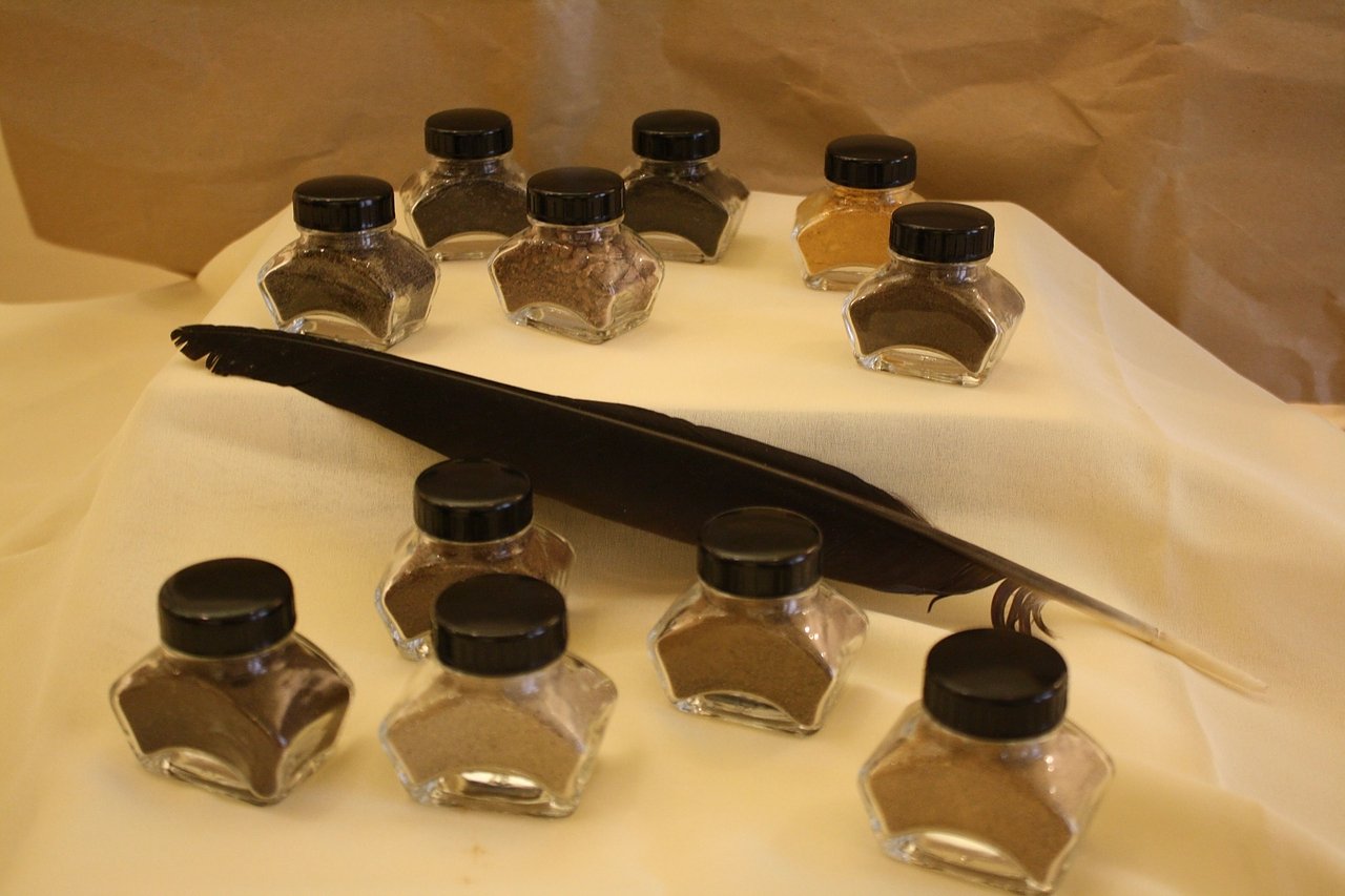 Entweder holte sich Carola Lantermann die Erde von den Orten selbst oder bat um Zusendung. Jede der Erden, Essenz des Lebens in seiner Unterschiedlichkeit, wie sie es ausdrückt, füllte sie in Tintengläser. Dazu legte sie eine große Krähenfeder. Magischer Vogel für magische Texte, gefunden auf dem Weg zwischen Sarah Kirsch und mir.Generell sieht die Künstlerin ihren Schaffensprozess so: Am Anfang meiner Arbeit ist die Entdeckung eines Ortes, Materials, einer Situation.