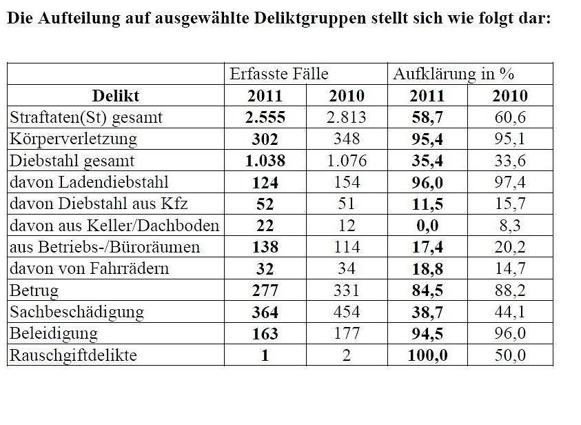 Für die Polizeiinspektion Kyffhäuser sind im Jahr 2011 insgesamt 2.555 Straftaten erfasst worden und bedeuten damit einen Rückgang von 258 Straftaten (-9,2 %) gegenüber dem Jahr 2010. Davon konnten im Berichtszeitraum 1.501 Fälle (1.706 im Jahr 2010) geklärt werden. Die Beamten ermittelten dabei 1.254 Tatverdächtige (1.445 im Jahr 2010). Es wurde eine Aufklärungsquote von 58,7 % erreicht (2010 = 60,5%).