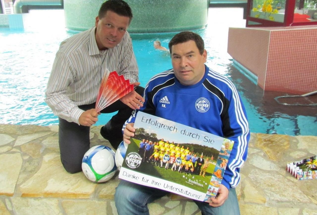 Zwischen Frank Kirchhoff vom Wacker-Präsidium und Badehaus-Geschäftsführer Jens Eisenschmidt ist eine weitere Zusammenarbeit vereinbart worden. Jeder Besucher des Derbys zwischen Wacker Nordhausen und Eintracht Sondershausen erhält an den AKS-Kassen eine kostenlose Fan-Klatsche. In dieser Klatsche ist ein Badehaus-Gutschein integriert, um nach dem hoffentlich heißen Spiel, in den kommenden Tagen abzuschalten oder selbst aktiv zu sein.