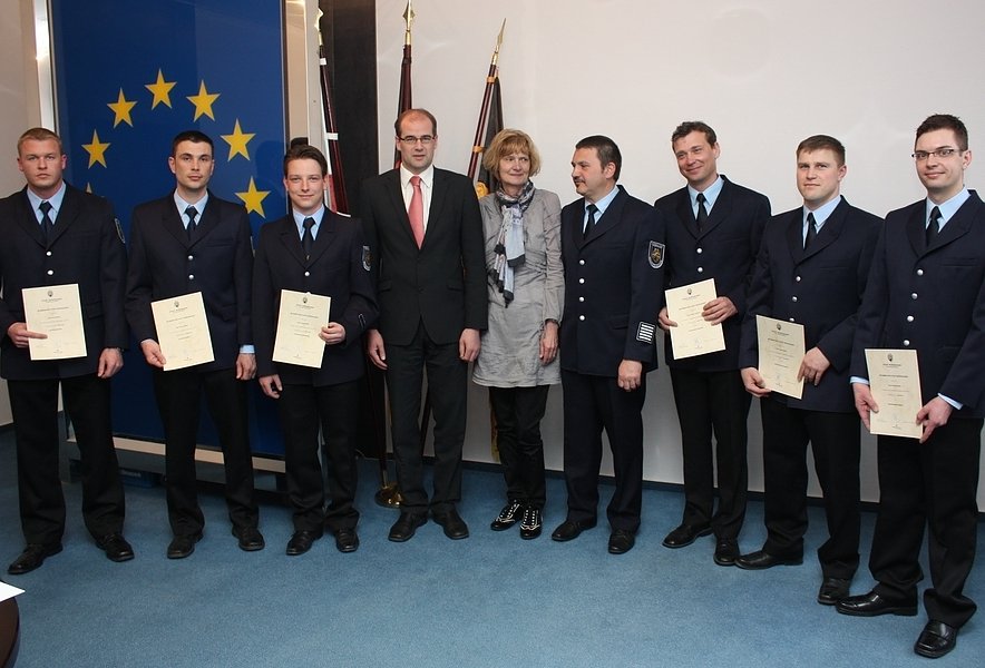 Ihre Ausbildung noch vor sich haben Ingo Nießen (2.v.r.), Mario Beykirch (3.v.r.) und Pascal Hertel (rechts): Als Brandmeisteranwärter werden sie in den kommenden zwei Jahren ihre Berufsausbildung bei der Nordhäuser Feuerwehrausbildung absolvieren.