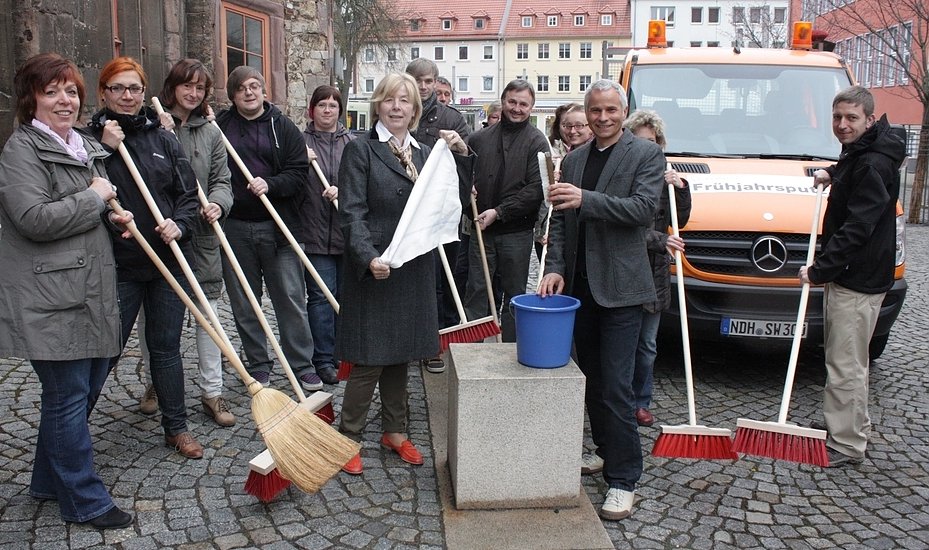 Den symbolischen Auftakt zum Frühjahrsputz hat heute Oberbürgermeisterin Barbara Rinke (Mitte) vor dem Nordhäuser Rathaus gegeben. Unud wie in jedem Jahr wird dabei symbolisch der Besen geschwungen...