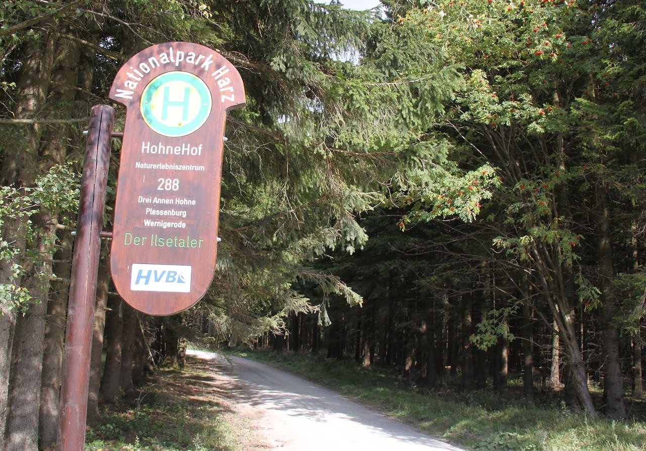 Auch den HohneHof erreichen Sie umweltfreundlich mit dem HATIX - hölzernes Nationalpark-Bushaltestellenschild am HohneHof bei Drei Annen-Hohne. Foto Frank Steingass, Nationalpark Harz.