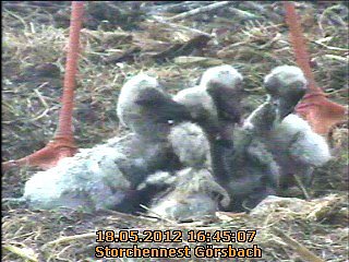 Autor: nnzObwohl Nummer fünf auch immer Futter abbekommt, sind seine Chancen flügge zu werden sehr gering, denn schon im Alter von drei Wochen braucht jedes Küken etwa 850 Gramm Nahrung Täglich und wenn die Eltern diese Menge nicht aufbringen können, weil es zu Beispiel zu trocken ist, werden immer die kleinsten zuerst abgeworfen. Wollen wir hoffen das, das Wetter mitspielt und für uns ein gutes Storchenjahr wird.
