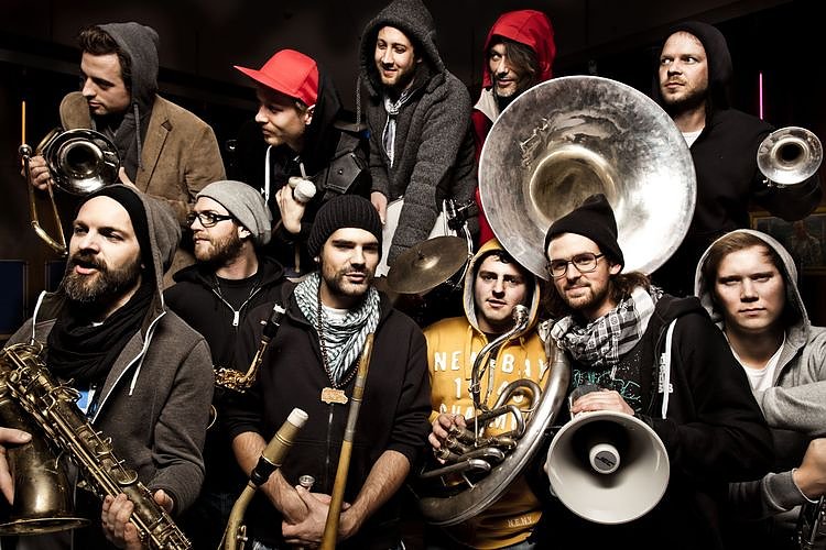 Danach lässt es die Urban Brass Marching Band Moop Mama richtig krachen. Als die Hardrockband unter den Blaskapellen und als die Hip Hop-Blasmusikanten wurde die Münchener Combo schon bezeichnet. Ob mit brachial lautem Rap durch das Megafon oder unverstärkt und heimlich, leise flüsternd wollen Moop Mama Standpunkt beziehen, Fragen stellen und unbequem sein. Mühelos reißen sie dabei sämtliche Genregrenzen ein und bringen das Publikum zum kochen.