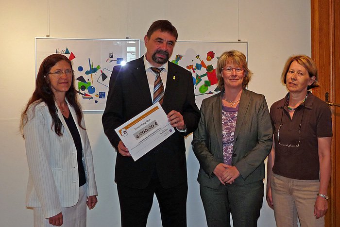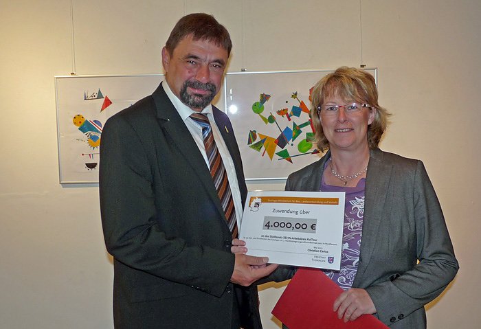 Staatssekretärin Inge Klaan übergab stellvertretend für Minister Carius heute in Sondershausen einen Lottomittelscheck in Höhe von 4.000 Euro an Bürgermeister Joachim Kreyer als Druckkostenzuschuss für den Katalog, der anschließend die künstlerischen Arbeiten der Biennale dokumentieren soll. Die Arbeitsgemeinschaft Nordthüringer Städte im Südharz-Eichsfeld-Hainich-Netz (SEHN) ist ein gelungenes Beispiel interkommunaler Kooperation, sagte Staatssekretärin Klaan. Um den Herausforderungen des demografischen Wandels erfolgreich zu begegnen, ist es notwendig, dass die Kommunen abgestimmt vorgehen und sich gemeinsam engagieren.