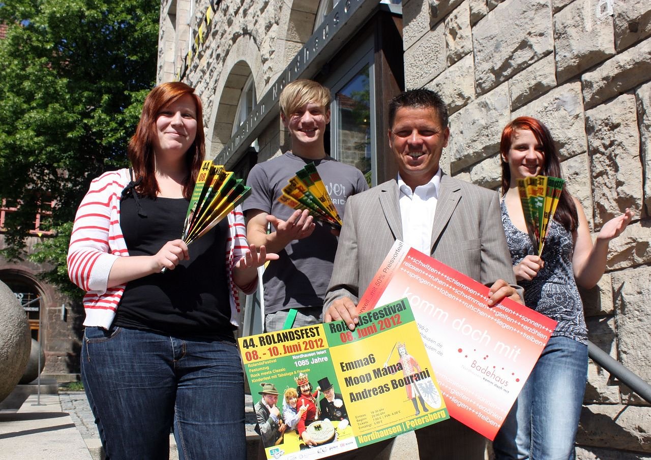 Anna Laura Wieninger aus der Stadtinformation Nordhausen, Robert Malura und Lisa Varges , Schülerpraktikanten des Staatlichen Berufsbildenden Gymnasiums Nordhausen und Jens Eisenschmidt klatschen schon mal Probe. (Foto: Ilona Bergmann)