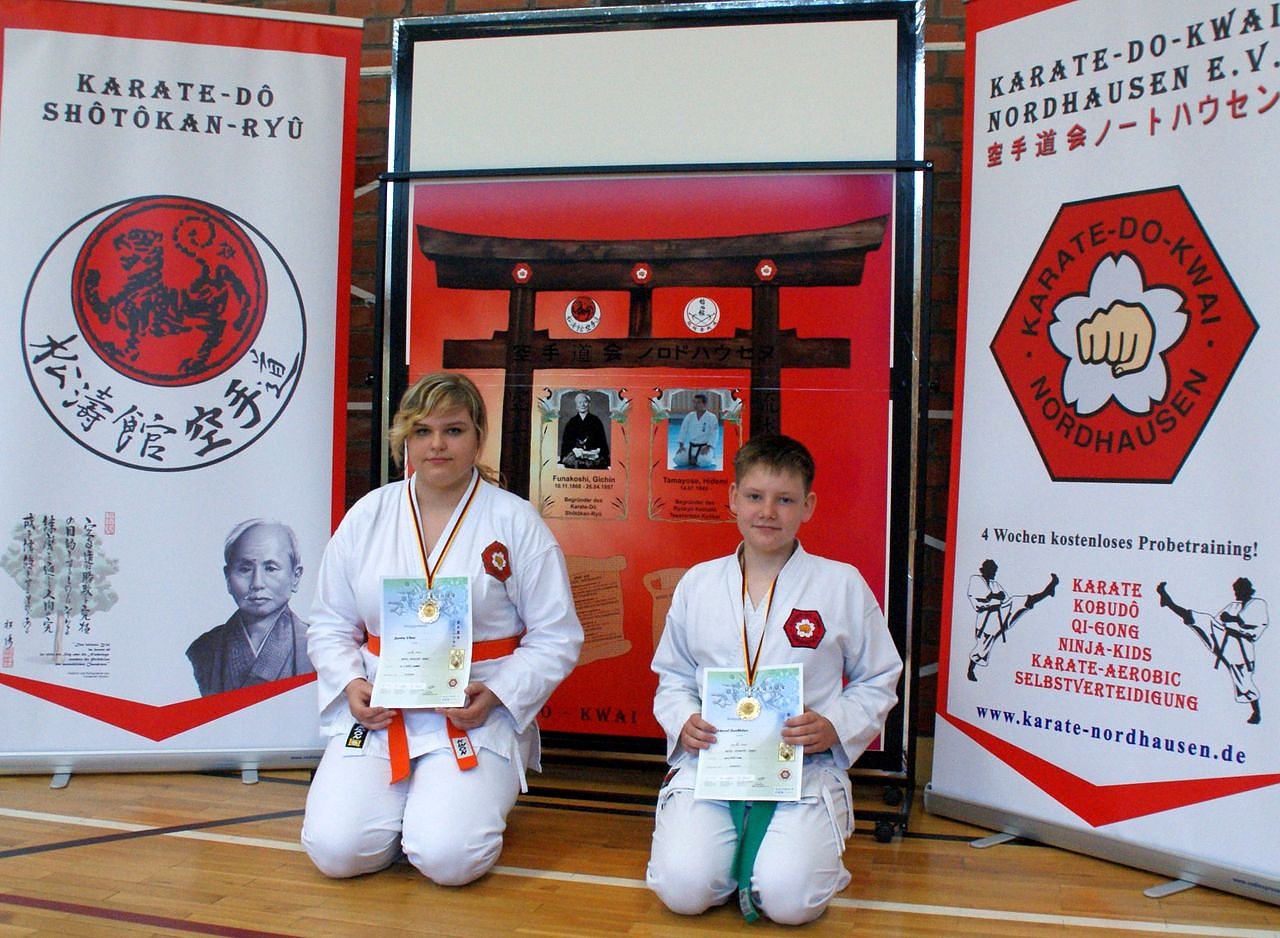 Autor: nnzJeanine Uhder (links) und Marcel Sanftleben (rechts) ließen daher die Torte erst einmal daheim stehen und eilten ins Dojo des Karate-Do-Kwai Nordhausen. Dort stellten sich dem Kampf - mit größtem Erfolg! Wie jedes Jahr herrschte hier wieder helle Aufregung. Für einige der Anfänger war es das erste Mal, dass sie vor Zuschauern gegen einen Gegner antreten mussten. Aber auch an den Erfahreneren ging die Nervosität nicht spurlos vorüber. Neben dem Siegesjubel galt es natürlich ebenso den Schmerz der Niederlage zu verarbeiten. Doch mit Beidem muss man ja bekanntlich lernen umzugehen. Wenigstens bekam jeder mindestens eine Urkunde als Trostpflaster. Denn gewonnen hatte man ja als Teilnehmer immerhin: gegen die eigene Angst und jene, die gar nicht erst den Mut aufbrachten überhaupt mitzumachen. In fünf verschiedenen Gruppen, gestaffelt nach Leistungsniveau, kämpften die Kinder bei dem Turnier gegeneinander. Zuerst startete die Gruppe der Mädchen, Anfänger – 9. Kyu (Weiß- und Weiß-Gelbgurte). Ihre Aufgaben waren Kata (Formenlauf) und Angriffstechniken auf einen Ball als Ziel. Erste wurde hier Maria Elpel vor Lara Escher und Jessica Fuochi, welche sich den 3. Platz mit Lilly Wendehost teilte.