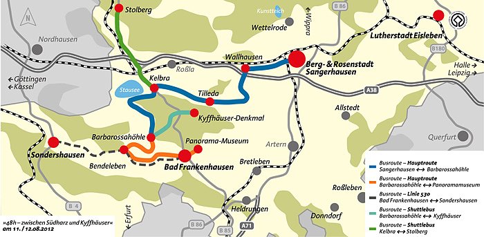 Die Region zwischen Südharz und Kyffhäuser können Sie auch außerhalb der 48 Stunden Tour mit dem Bus erreichen, nutzen Sie hierzu den Rufbus 504 - Kyffhäuserbus oder die Linie 461Kelbra-Badra-Sondershausen sowie der Linienbus 530 Sondershausen-Bad Frankenhausen-Artern.