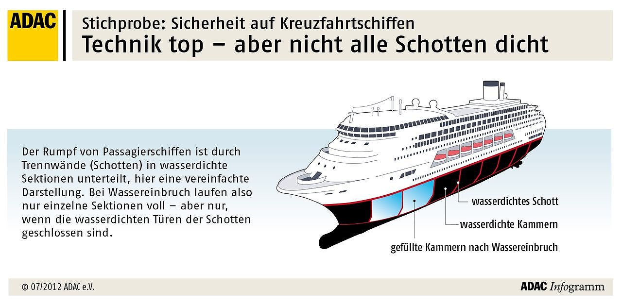 Das gravierendste Problem aus Sicht des ADAC liegt aber unterhalb der Wasserlinie: Fünf der zehn Schiffe (Adventure of the Seas, Norwegian Epic, MSC Fantasia, MSC Orchestra, MSC Splendida) waren laut Schiffsleitung mit Ausnahmegenehmigungen der Flaggenstaaten unterwegs. Mit dieser Erlaubnis dürfen die wasserdichten Türen (Schotten), die unterhalb der Wasserlinie liegen, auf See geöffnet bleiben, um Arbeitsabläufe auf den Versorgungsdecks zum Beispiel in der Wäscherei oder in den Lagerräumen zu erleichtern.
