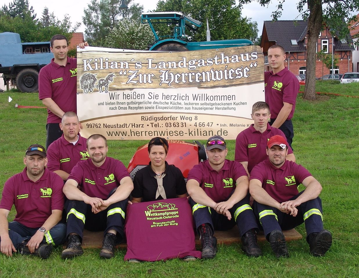 Hier möchten die Aktiven nicht nur mit besten Leistungen aufwarten, sondern auch einheitlich gekleidet ihre Herkunft signalisieren. Sehr zur Freude der Wettkampfgruppe der Freiwilligen Feuerwehr Neustadt-Osterode überreichte Melanie Kilian, Inhaberin des Landgasthauses "Zur Herrenwiese" in Neustadt den Aktiven einen druckfrischen Satz Shirts. Frau Kilian und ihr Team ünterstützen zudem viele weitere Aktionen der Freiwilligen Feuerwehr Neustadt-Osterode: Kinderfreizeiten, Zeltlager, Kinderfest.