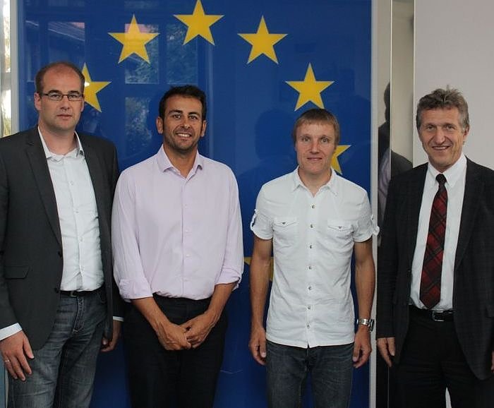 Bei einem Treffen im Rathaus mit Oberbürgermeister Dr. Klaus Zeh (rechts) und Bürgermeister Matthias Jendricke (links) haben Scheunenhof-Triathlon-Organisator Ulrich Konschak (2.v.r.) sowie der ICAN-Gründer und Geschäftsführer Sunil Bhardwaj Capo (2.v.l.) diese Vereinbarung jetzt getroffen.