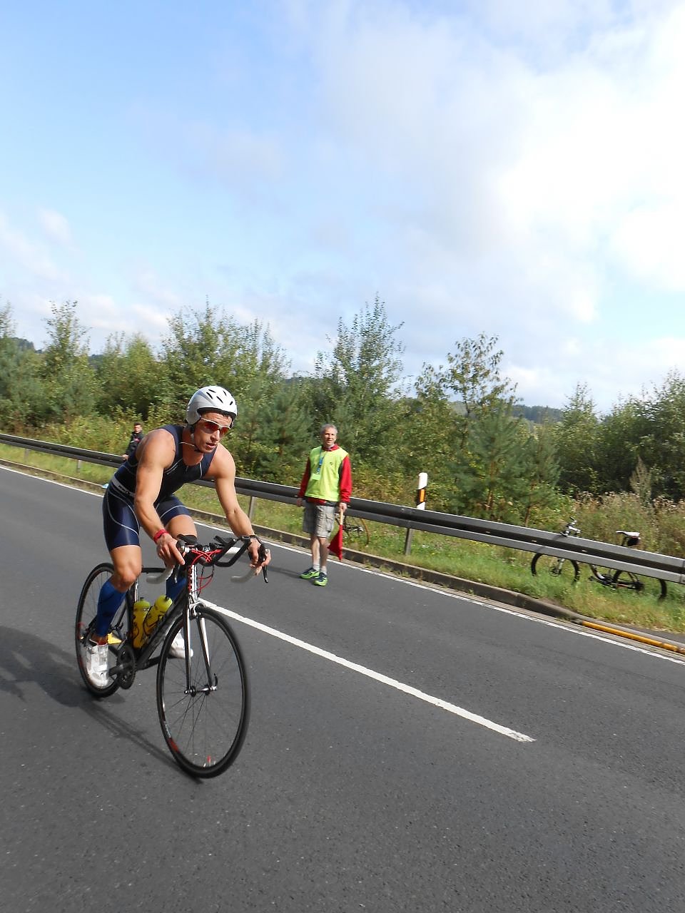 Bei Kilometer 16 hat Konschak (Bild) Seidel dann eingeholt und wechselte als Vierter hinter dem Jenaer Sebastian Pflüger, Hoffmann und Beck auf den abschließenden zehn Kilometer langen Lauf. Immer noch gut platziert war Peter Seidel als Fünfter wenige Sekunden hinter Konschak. Chancen dranzubleiben hatte er allerdings nicht. Konschak lief in 33:01 Minuten die beste Zeit aller gestarteten Athleten und überholte schon nach kurzer Zeit den Drittplatzierten Sebastian Pflüger. 100 Meter vor dem Ziel war er auch an David Hoffmann, der nach dem Radfahren noch vier Minuten vor ihm lag, dran. Dieser beschleunigte aber noch einmal und rettete so knapp den zweiten Platz wenige Sekunden vor Konschak, der noch am Vortag eine 120 Kilometer lange Radeinheit absolvierte. Auch Peter Seidel erzielte mit Rang sechs am Ende eine Top Platzierung. Als dritter Nordhäuser Starter reihte sich Dennis Morgenstern mit dem 13. Platz ebenfalls im Vorderfeld ein. Nachdem er als 19. das Schwimmen beendete, kämpfte er sich durch die achtbeste Radzeit bis auf Rang zwölf nach vorne. Diesen hielt er auch in etwa bis ins Ziel.