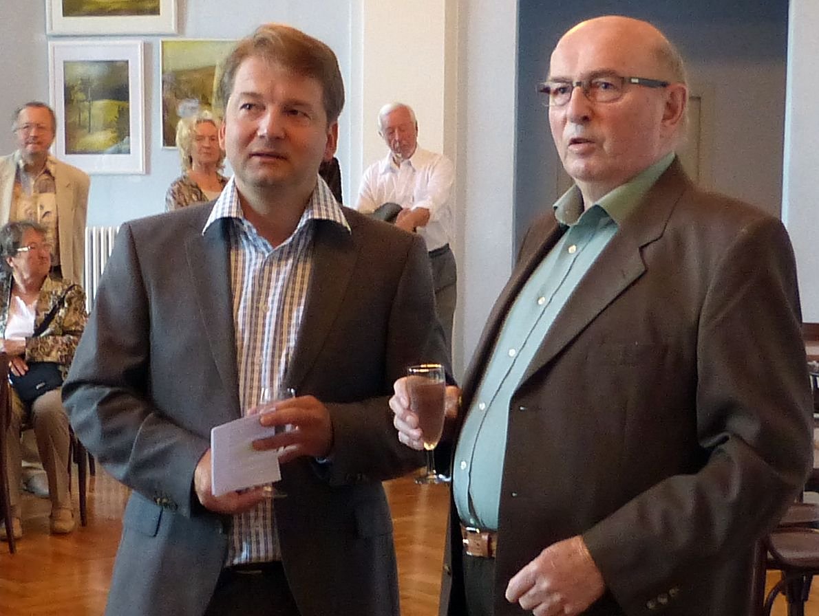 Fritz Wilhelm bedankte sich in einer kurzen Ansprache beim Theater für die Möglichkeit, seine Werke auszustellen, und führte dann die interessierten Besucher durch die Ausstellung. Neben Landschaftsgemälden aus Harz und Südharz liegt ein inhaltlicher Schwerpunkt auf Bühnenbildern aus seiner Zeit am Theater Nordhausen.