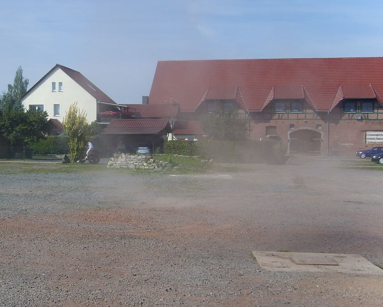 Autor: nnzNicht zum ersten Mal jagt dieser Quad-ATV-Fahrer (auf den Bildern am Montag Mittag um 12.11 Uhr) über den Scheunenhof und dreht auf dem Innenhof noch eine "Ehrenrunde", so dass es richtig staubt. Danach rast er auf dem Gehweg in Richtung Uthleber Strasse durch den Zugang für die Sündhäuser Kunden des Bauernmarktes.