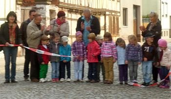 Um für die nächsten 50 Jahre mit Zeitzeugen aufzuwarten, wurden die Kleinsten des Kindergartens Die kleinen Störche bei der Abnahme der Straße mit dem symbolischen Banddurchschneiden beauftragt. Nach Beendigung der Baumaßnahme bedankte sich Bürgermeister Siegfried Junker bei allen Beteiligten für die gute Zusammenarbeit und Unterstützung mit einem kleinen Imbiss.