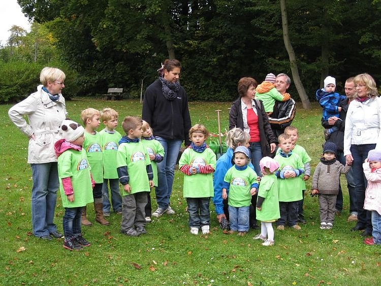 Die Kinder der Kindertagesstätte Regenbogen trafen sich zum Tag der Deutschen Einheit mit ihren Eltern, Großeltern und Geschwistern um im Kurpark einen Ginko Baum zu pflanzen.