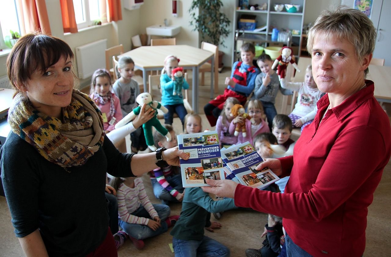 Autor: nnzFranziska Gunkel (links), Lehrerin an der Evangelischen Grundschule, hat heute den Präventionswegweiser zur schulischen Gesundheitsförderung, von Kathrin Wolff vom Gesundheitsamt erhalten. Die 1. Klasse der Grundschule hat heute ein Angebot des Gesundheitsamtes genutzt – es ging um sexualpädagogische Aufklärung.