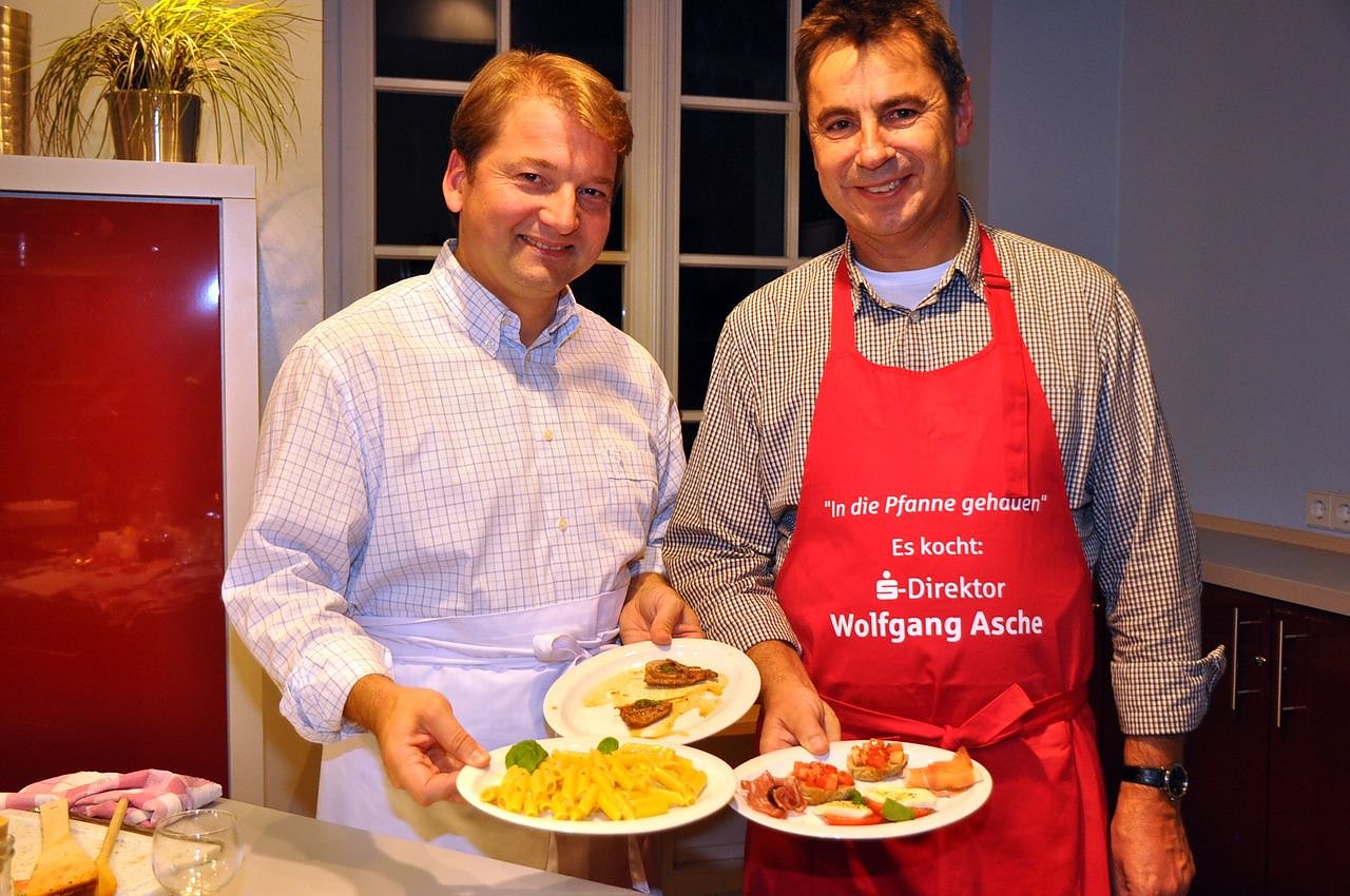Anlässlich seines 40jährigen Dienstjubiläums überraschten die Sparkassenmitarbeiter ihren Chef mit einigen Highlights. Da Wolfgang Asche mit Leib und Seele Hobbykoch ist, kam er der Einladung seiner Mitarbeiterinnen und Mitarbeiter in die Theater-Koch-Show mit Lars Tietje gern nach.