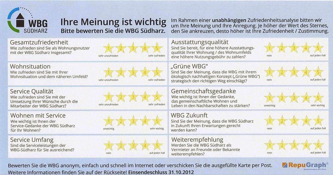 Dabei wird jederzeit die Anonymität der Mieter garantiert. Die ausgefüllten Karten können in jeden Postbriefkasten geworfen werden, das Porto ist bereits bezahlt. Für diejenigen Mitglieder, die einen Internetzugang besitzen, geht das Ausfüllen noch bequemer von Zuhause aus. Sie müssen sich auf die Seite www.rg-code.de/wbg-suedharz einwählen und starten die Umfrage mit einem automatisch erstellten Aktivierungscode.