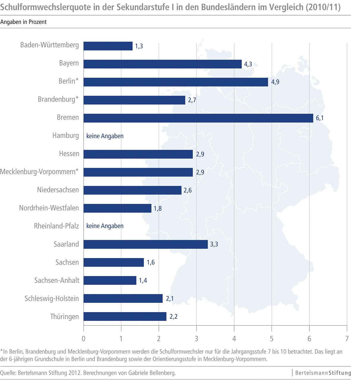 Mehr als 1.800 Schüler haben in Thüringen im Schuljahr 2010/11 zwischen Klasse fünf und zehn die Schulform gewechselt. Das sind 2,2 Prozent aller Schüler in der Sekundarstufe I, womit Thüringen genau im Bundesdurchschnitt liegt. Für die meisten dieser Schulformwechsler ging der Fahrstuhl nach unten: Auf einen Aufsteiger kommen 3,2 Absteiger. Thüringens Schulsystem verzeichnet damit ein eher ungünstiges Verhältnis zwischen Auf- und Abstiegen. Unter den ostdeutschen Bundesländern liegt Thüringen im Mittelfeld. Dies geht aus einer aktuellen Studie der Bertelsmann Stiftung zur Durchlässigkeit der Schulsysteme hervor.
