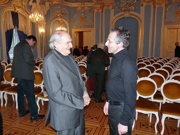 Das Schlossmuseum Sondershausen zeigt in dieser Ausstellung rund 30 Werke von Heinz Scharr (li.) und musikalisch wurde die Vernissage abgerundet von Dr. Dan Suciu (re.), Solopauker des Lohorchesters Sondershausen, der für die Eröffnung eine eigene Komposition zu Ehren von Heinz Scharr zu gehör brachte.