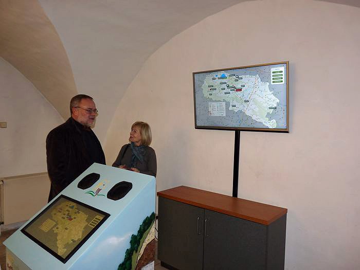 Autor: khhIm Regionalmuseum Bad Frankenhausen wurde heute der von der Naturparkverwaltung Kyffhäuser federführend bearbeitet Touch-InfoPoint offiziell der Öffentlichkeit übergeben. Renate Weinert, die ehemalige Leiterin des Regionalmuseums Bad Frankenhausen und Naturparkbotschafterin drückt im Regionalmuseum Bad Frankenhausen offiziell auf die interaktive Karte. Sie hatte das auch schon bei der Generalprobe getan, noch auf kleine Fehler hingewiesen, aber heute ging alles glatt.