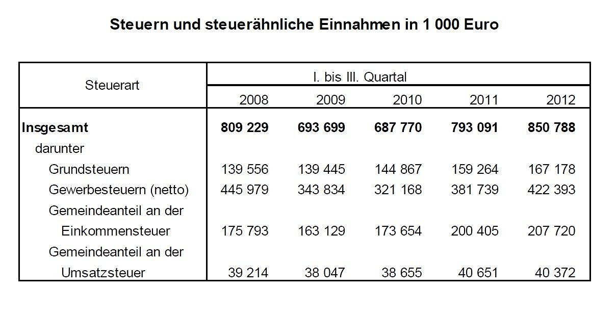 Autor: psgKommunale Steuereinnahmen stiegen um 7 Prozent. Die Steuereinnahmen der Thüringer Städte und Gemeinden stiegen im Zeitraum Januar bis September 2012 auf 851 Millionen Euro. Das sind nach Mitteilung des Thüringer Landesamtes für Statistik gegenüber dem gleichen Vorjahreszeitraum 58 Millionen Euro bzw. 7 Prozent mehr.