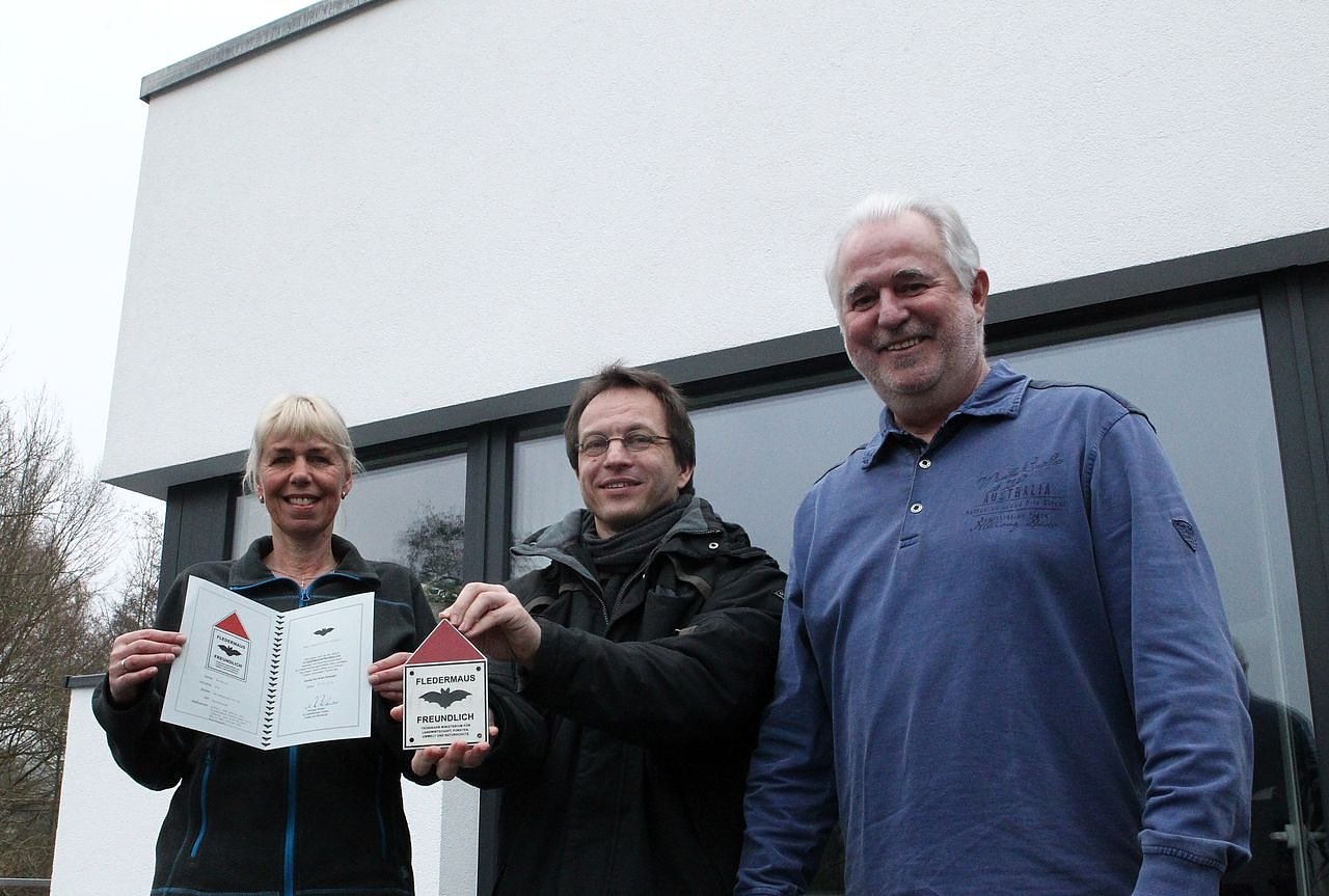 Keine Frage für das Ehepaar: die Tiere können dieses Quartier auch weiterhin nutzen und so können Uta und Jürgen Reinholz jetzt die Plakette anbringen, die ihnen und ihrem Haus die Fledermausfreundlichkeit attestiert. Überreicht wurde sie von Matthias Piontek, der in der unteren Naturschutzbehörde des Landratsamtes tätig ist.