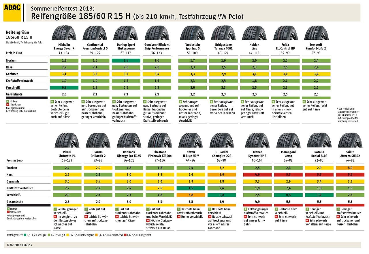Bei den 19 getesteten kleineren Reifen der Größe 185/60 R15 (z. B. für Audi A1, Mini, Fiat Punto, Renault Clio und VW Polo) werden neun mit gut bewertet. Vier Reifen bekommen befriedigend, zwei ein ausreichend, vier ein mangelhaft. Die besten Fünf sind: Michelin Energy Saver + (Bestnote beim Verschleiß), Continental PremiumContact 5, Dunlop Sport BluResponse (Bestnoten auf trockener und nasser Fahrbahn), Goodyear Efficient Grip Performance (Bestnote bei Nässe) und Vredestein Sportrac 5. Auf nasser Fahrbahn durchgefallen sind: Kleber Dynaxer HP 3, Mahagoni Verso, Rotalla Radial F108 und Sailun Atrezzo SH402, der sogar auf trockener Fahrbahn schwächelt.