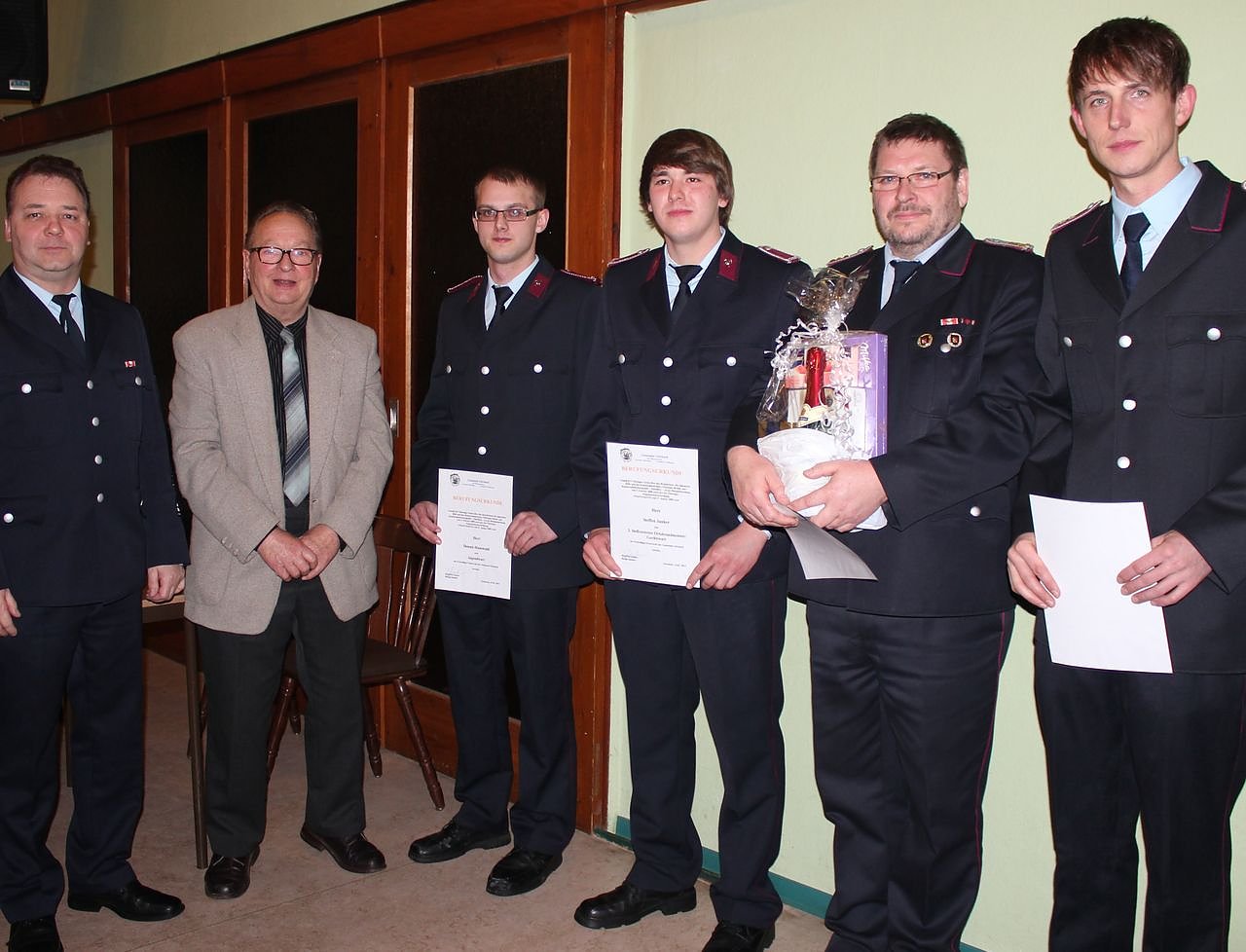 Kreisbrandinspektor Wilfried Ittershagen, Bürgermeister der Gemeinde Görsbach Siegfried Junker, Jugendwart Denis Hauswald, Gerätewart Steffen Junker, stellvertretender Ortsbrandmeister Bernd Hoffmann, Ortsbrandmeister René Vopel