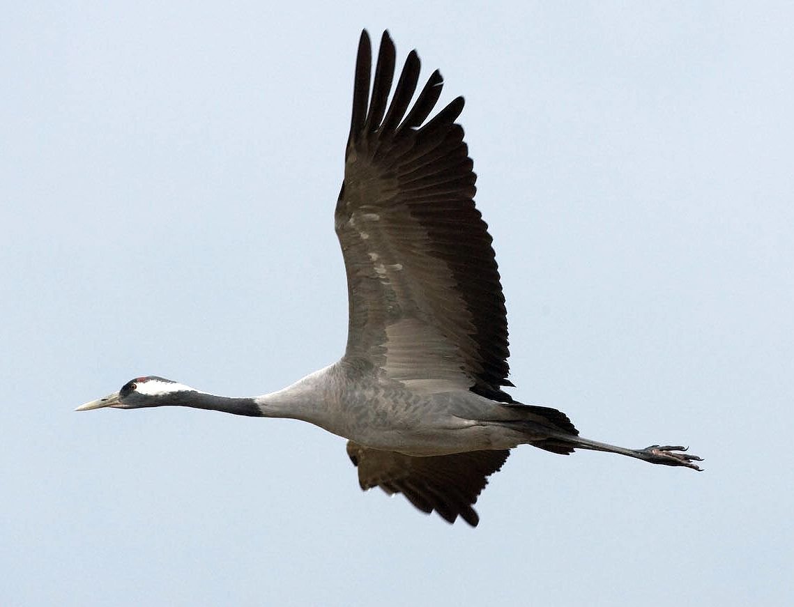 Außerdem wirken die Flügel der Kraniche eckig und sie haben sehr lange Federn an den Flügelenden. Die Flügelenden nennt man auch Handschwingen. Diese spreizen die Kraniche ähnlich wie Adler oder Geier weit ab. Ein weiteres Merkmal sind die langen Beine der Kraniche, die im Gegensatz zu denen der Gänse im Flug über die Schwanzfedern hinausragen.