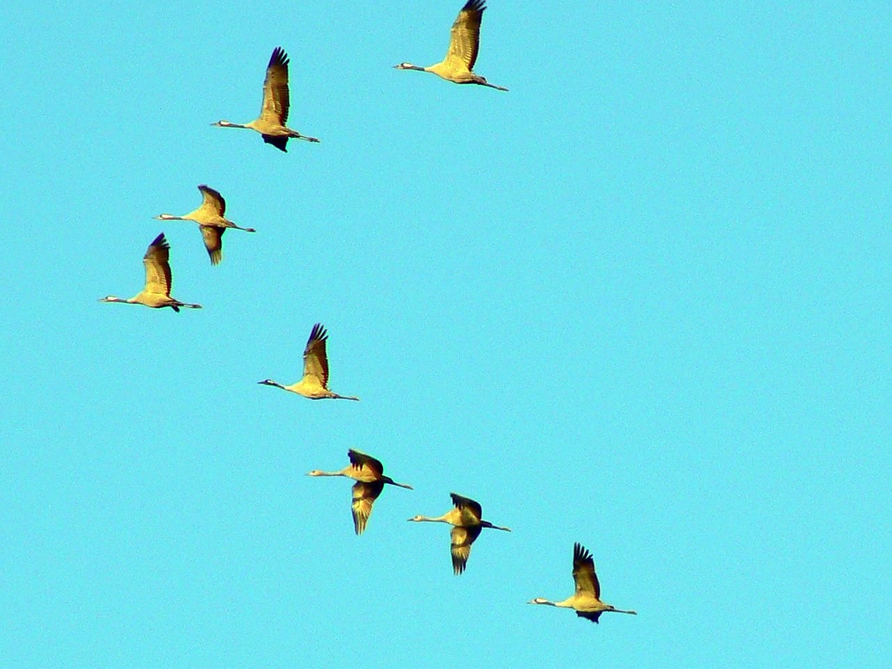 Kraniche, wie auch Gänse, fliegen häufig in Keilformationen. Dadurch können die Vögel bei ihren weiten Flügen Energie einsparen, indem sie den durch den Vordermann entstehenden Windschatten nutzen. Für den Laien ist es oft schwierig Kraniche und Gänse zu unterscheiden. Kraniche sind mit 180 bis 222 Zentimeter etwas größer wie die Wildgansarten mit 175 Zentimetern.