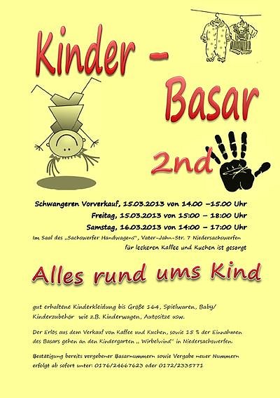 Der Erlös aus dem Verkauf von Kaffee und Kuchen, sowie 15 Prozent der Einnahmen des Basars gehen zugunsten der Kindertageseinrichtung "Wirbelwind" in Niedersachswerfen.Wir freuen uns auf Ihren Besuch zum Kinderbasar auf dem Saal des Sachswerfer Handwagens.