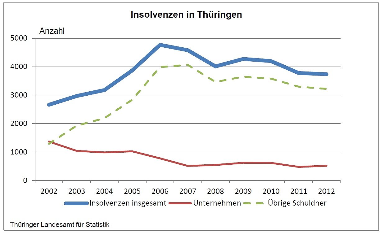 Die Thüringer Amtsgerichte entschieden im Jahr 2012 über 3 739 Insolvenzverfahren. Davon entfielen 13,9 Prozent auf Unternehmen und 86,1 Prozent auf übrige Schuldner. Weitere Einzelheiten wie immer mit einem einzigen Klick...