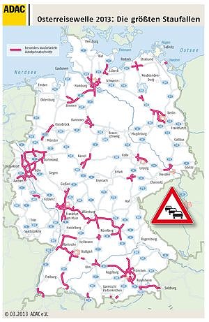 Durch den Ferienbeginn in elf Bundesländern am kommenden Wochenende wird die Osterreisewelle auf fast allen wichtigen Fernstraßen spürbar sein. Vor allem rund um die Ballungszentren und auf den Strecken in Richtung Süden werden sich zeitweise Kolonnen bilden...
