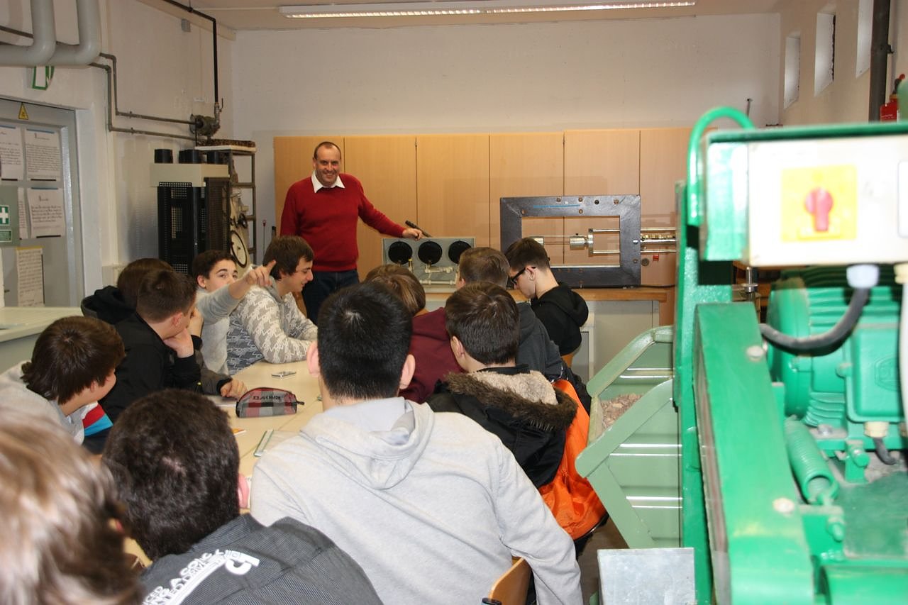 Zu den Fotos: Um in der Wirtschaft Qualität sichern zu können, bedarf es einer fundierten Ausbildung im neu eingerichteten Materialprüflabor. Der Ständige Vertreter des Schulleiters, Mathias Wiegleb bestimmt gemeinsam mit Schülern der FO 11 Technik im Labor das Spannungsdehnungsdiagramm für Betonstahl.