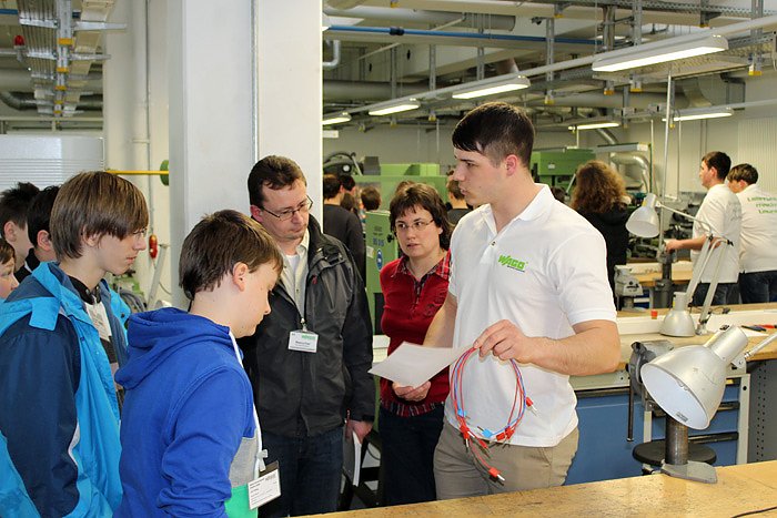 Autor: khhDer "Tag der Berufe" der Agentur für Arbeit bereitet Schülerinnen und Schüler ab der 7. Klasse praxisnah auf die Berufswahl vor. WAGO - mit etwa 1.000 Mitarbeitern am Standort Sondershausen einer der größten Arbeitgeber Nordthüringens - unterstützt dieses Konzept. So bekamen Jugendliche und ihre Eltern Einblick in die Fertigung des High-Tech-Unternehmens und lernten verschiedene technische Ausbildungsberufe kennen. "Bei der Wahl für einen Ausbildungsberuf spielen auch die Eltern eine wichtige Rolle. Deshalb geben wir ihnen hier die Gelegenheit, gemeinsam mit ihrem Nachwuchs die WAGO- Arbeitswelt kennenzulernen", erklärt Marcel Matzschke, Leiter der Ausbildungswerkstatt.
