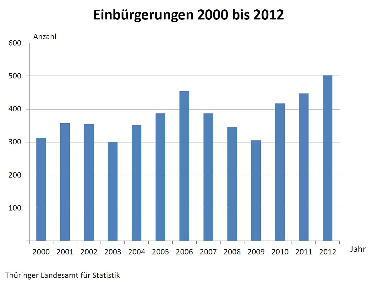 Im Jahr 2012 erhielten 502 ausländische Personen (235 Männer und 267 Frauen) in Thüringen durch Einbürgerung die deutsche Staatsangehörigkeit. Das waren nach Mitteilung des Thüringer Landesamtes für Statistik 55 Einbürgerungen bzw. 12 Prozent mehr als im Jahr zuvor...