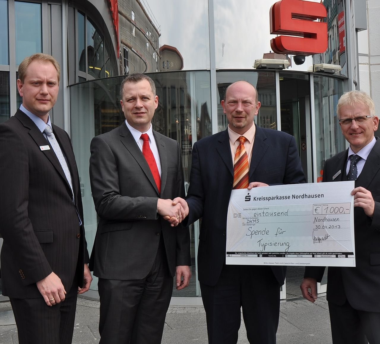 Autor: redVon links: Hans-Joachim Klapproth und Thorsten Lindner übergeben stellvertretend für alle Blutspender der Kreissparkasse Nordhausen den Erlös in Höhe von 1.000 Euro an den Personalratsvorsitzenden Matthias Marquardt und Sebastian Gräser, Leiter Vorstandssekretariat zur Überweisung an die DKMS.