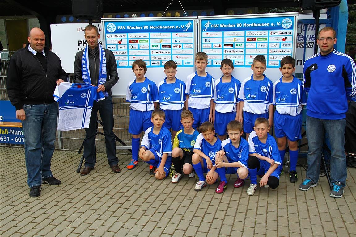 Unter dem Beifall der gut 1000 Zuschauer nahmen die jungen Fußballer die blau-weiße Spielkleidung freudig in Empfang. Der Verein bedankt sich bei der WBG für diesen neuerlichen Beweis der Unterstützung unseres Nachwuchses recht herzlich.