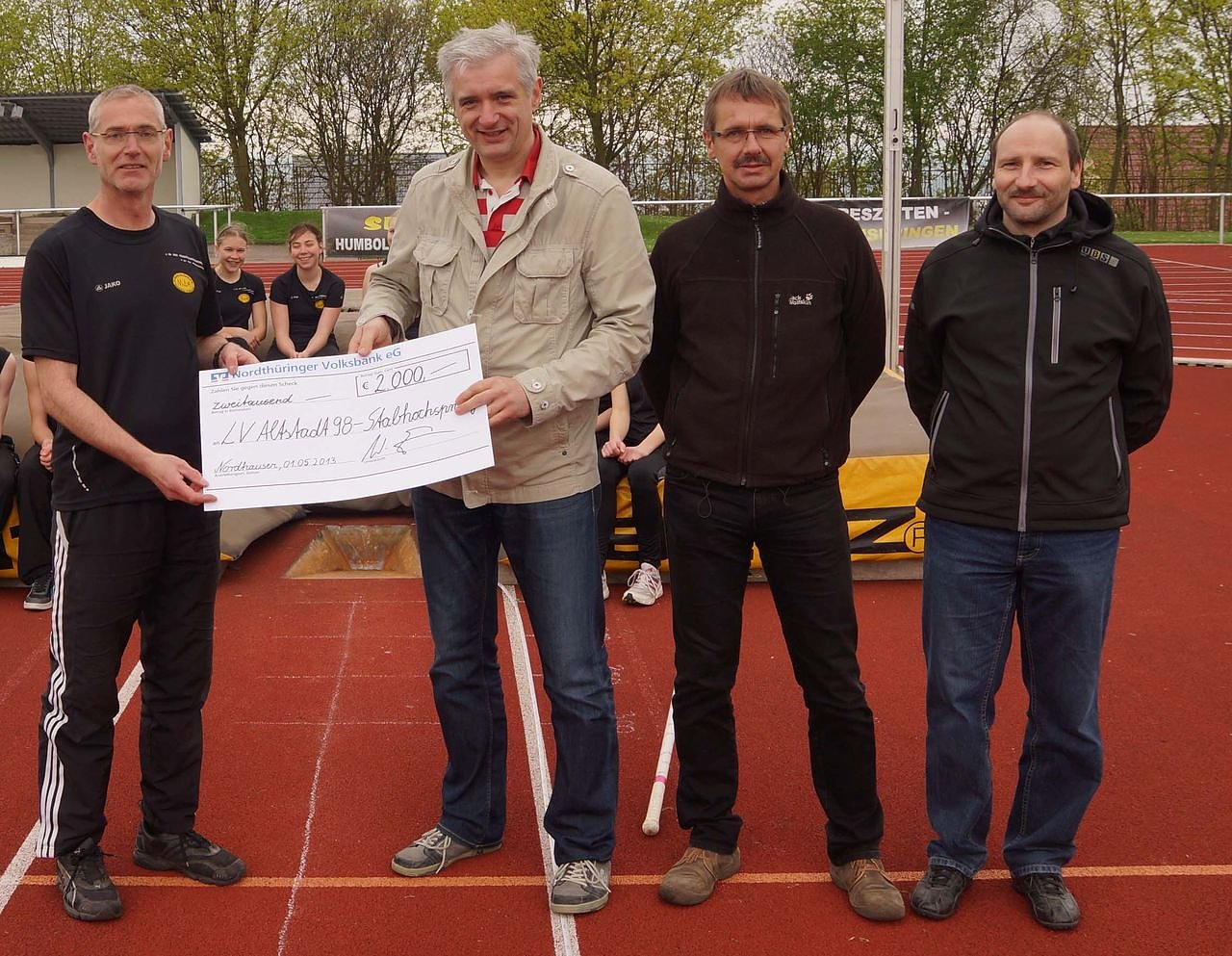 Die große Freude über die zahlreiche Hilfe wurde zum Jubel bei der Bekanntgabe von zwei Großspenden: Der Rotary-Club Nordhausen, vertreten durch Herrn Dr. Kohler und Herrn Engelmann, übergab einen zweckgebundenen Scheck für die Stabhochsprunganlage. Mitglieder des Rotary-Clubs hatten sich im Vorjahr im Rahmen einer eigenen Veranstaltung während der Stabhochsprung-Ausstellung in der Galerie der Kreissparkasse intensiv über die Arbeit der Stabhochsprunggruppe informiert.