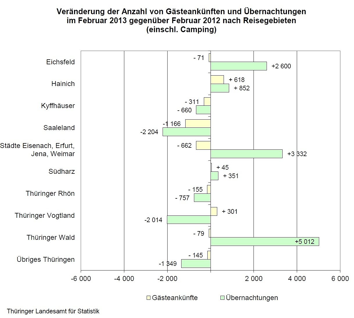 Deutlich mehr Übernachtungen waren im Februar 2013 im Thüringer Wald (+5 012 Übernachtungen), im Reisegebiet der Städte Eisenach, Erfurt, Jena und Weimar (+3 332 Übernachtungen) und im Eichsfeld (+2 600 Übernachtungen) zu verbuchen. Allerdings ging in allen drei Reisegebieten gleichzeitig die Anzahl der Gästeankünfte geringfügig zurück. Deutliche Verluste waren im Reisegebiet Saaleland zu beobachten, wo gegenüber Februar 2012 die Zahl der Übernachtungen um 2 204 und die Zahl der Gästeankünfte um 1 166 zurückging.