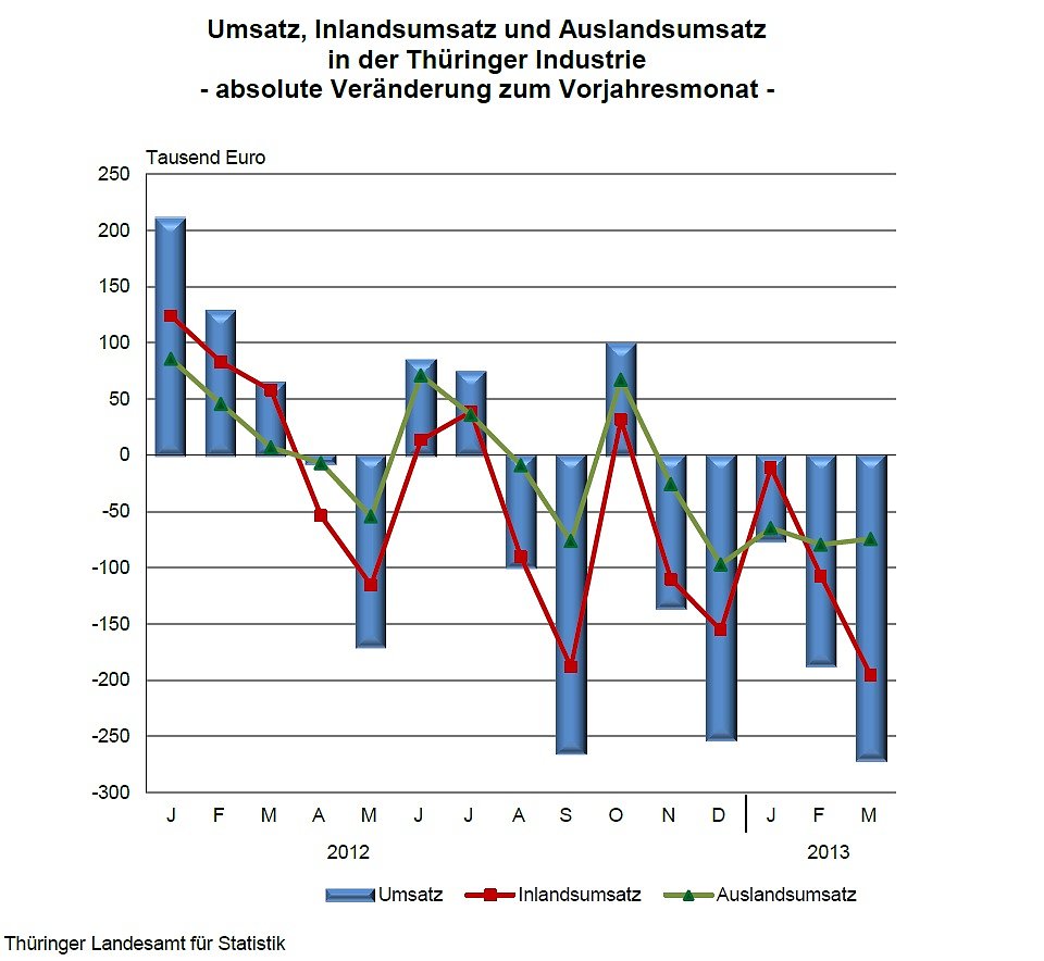 Die 878 Thüringer Industriebetriebe mit 50 und mehr Beschäftigten erzielten im März 2013 einen Umsatz in Höhe von 2,3 Milliarden Euro. Nach Mitteilung des Thüringer Landesamtes für Statistik betrug der Rückgang 270 Millionen Euro bzw. 10,4 Prozent zum März 2012 (bei zwei Arbeitstagen weniger - arbeitstäglich bereinigt: -1,5 Prozent).