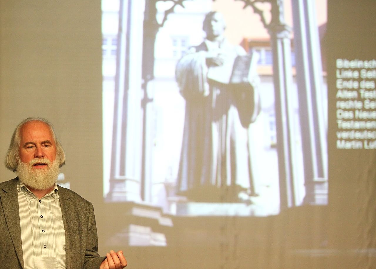 Diesen Part übernahm der Theologe Dr. Martin Rehahn und berichtete über die verschiedenen Darstellungsformen von Luther. Zum Beispiel mal mit geschlossener, mal mit geöffneter Bibel.