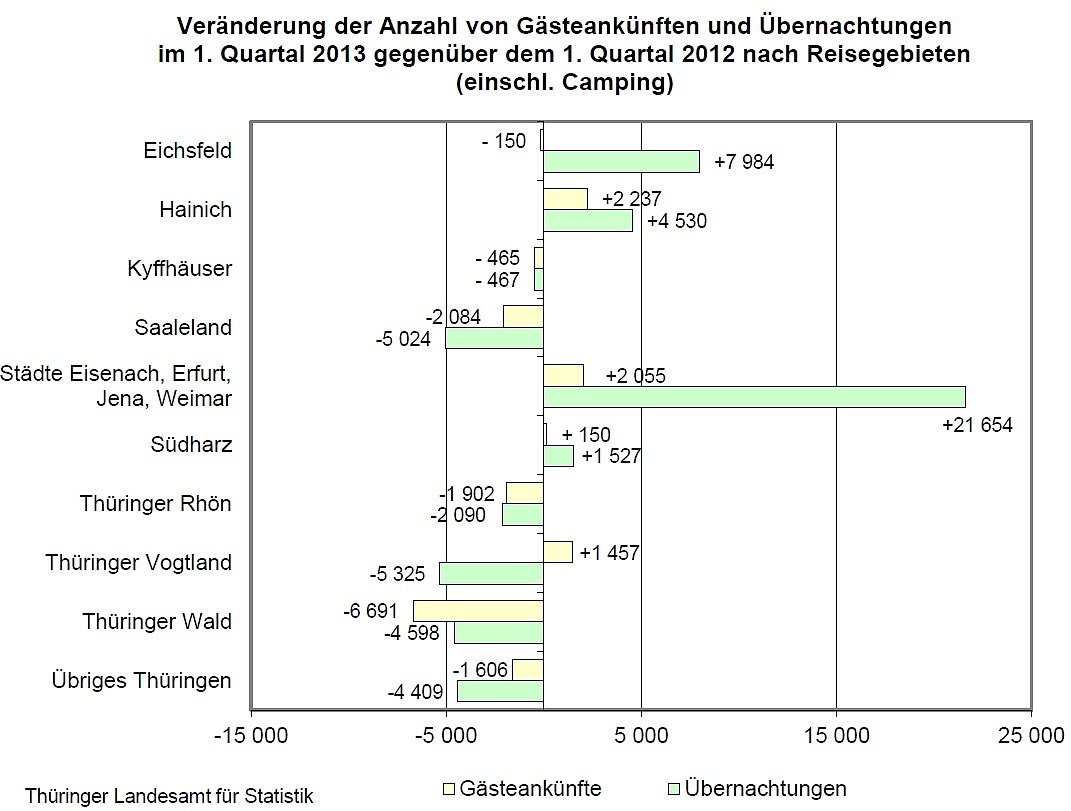Der Anstieg der Übernachtungszahlen in Thüringen resultierte im 1. Quartal 2013 insbesondere aus der positiven Entwicklung im Reisegebiet der Städte Eisenach, Erfurt, Jena und Weimar (+21 654 Übernachtungen), im Eichsfeld (+7 984 Übernachtungen), im Hainich (+4 530 Übernachtungen) und im Südharz (+1 527 Übernachtungen).