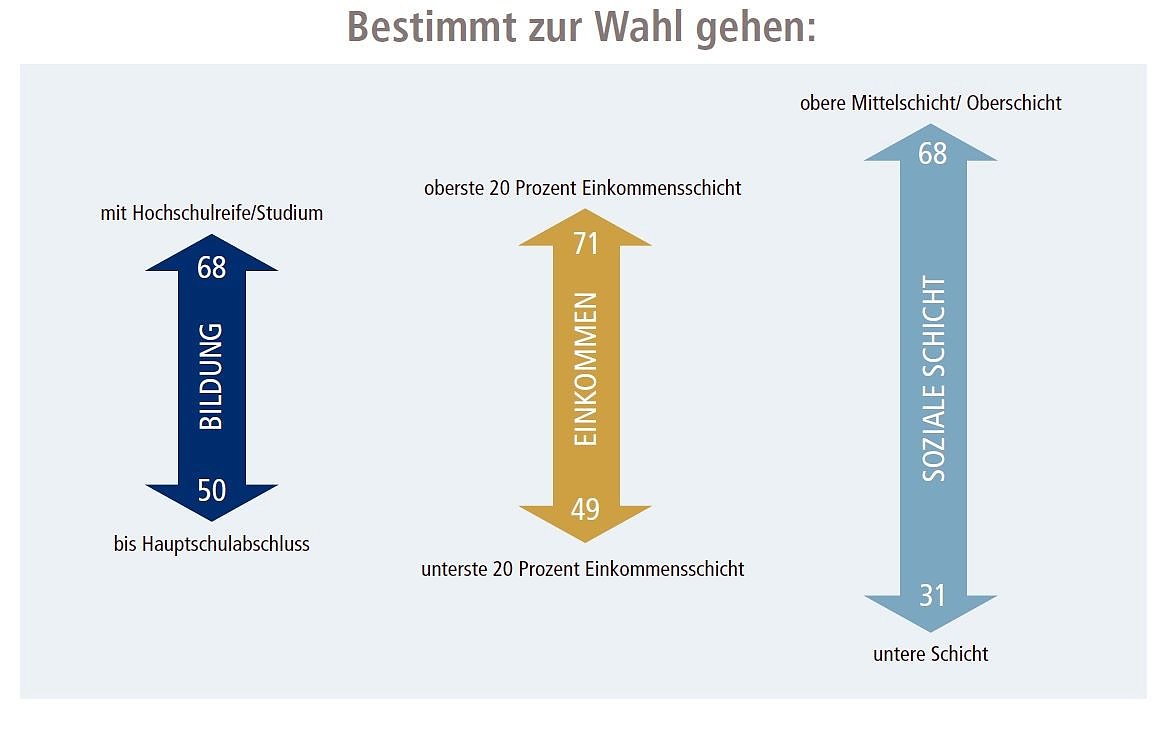 Bis Mitte der 80er Jahre gaben noch rund 90 Prozent aller Wahlberechtigten bei Bundestagswahlen ihre Stimme ab. Erst danach brach die Wahlbeteiligung ein, bis zum historischen Tiefstand von knapp über 70 Prozent bei der vergangenen Wahl. Dieser Rückgang ist in erster Linie darauf zurückzuführen, dass immer mehr Einkommensschwache und Bildungsferne am Wahlsonntag zuhause bleiben. Aktuell sagen 68 Prozent aus der oberen Schicht, dass sie bei der Bundestagswahl in jedem Fall wählen werden. In der unteren Schicht sind es dagegen nur 31 Prozent. Wir haben keinen Politik- oder gar Demokratieverdruss. Wir erleben aber eine zunehmend sozial gespaltene Demokratie, sagte Jörg Dräger, Vorstand der Bertelsmann Stiftung.