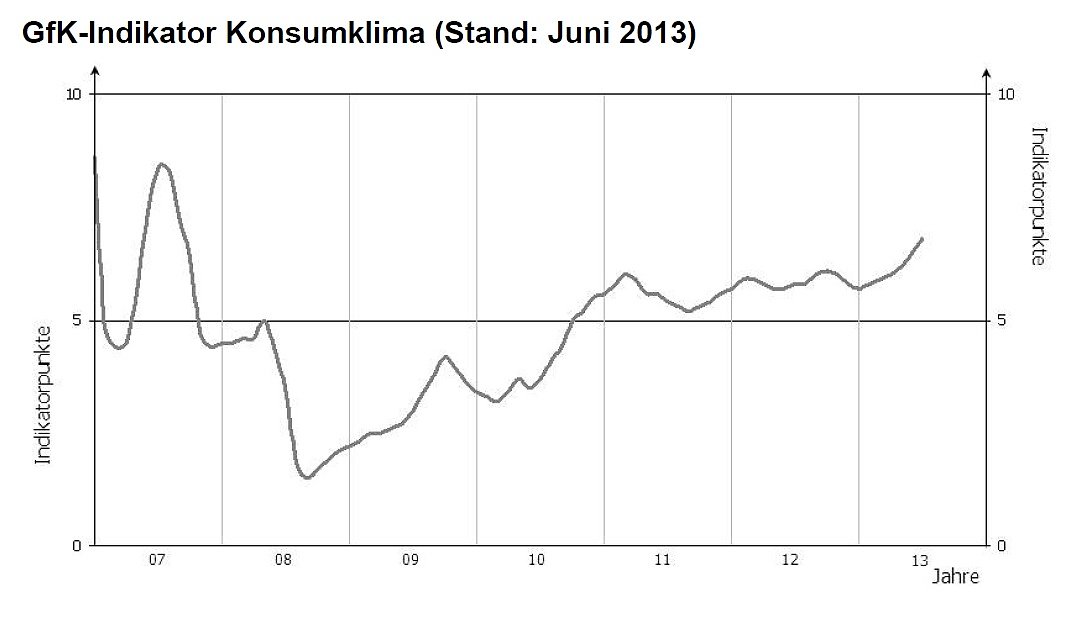 Der Gesamtindikator prognostiziert für Juli 2013 einen Wert von 6,8 Punkten nach 6,5 Zählern im Juni. Das ist der höchste Wert seit September 2007 (7,3 Punkte). Der private Verbrauch, der in Deutschland fast 60 Prozent des Bruttoinlandsprodukts umfasst, ist damit das stabilisierende Element der Konjunktur. Mit einem schwächelnden Konsum wäre auch die Bundesrepublik in den letzten Monaten in die Rezession abgerutscht. Denn sowohl von den Investitionen wie auch vom Außenbeitrag gehen derzeit keine sehr positiven Signale aus. GfK bestätigt damit seine zu Beginn des Jahres getroffene Prognose, wonach die privaten Konsumausgaben 2013 real um etwa 1 Prozent zulegen.Dies setzt allerdings voraus, dass die Schuldenkrise nicht mehr eskaliert, sondern nach und nach einer dauerhaften Lösung zugeführt wird. Sollte dies nicht der Fall sein, würde das Vertrauen der Konsumenten in die künftige Wirtschaftsentwicklung nachhaltig leiden. Dann stünden auch der Binnenkonjunktur schwere Zeiten bevor.