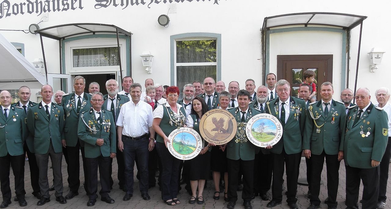 OB Klaus Zeh im Kreise der Mitglieder der Nordhäuser Schützenkompanie von 1420 und ihrem neuen Königspaar Heidi Uhlmann und Olaf Adler