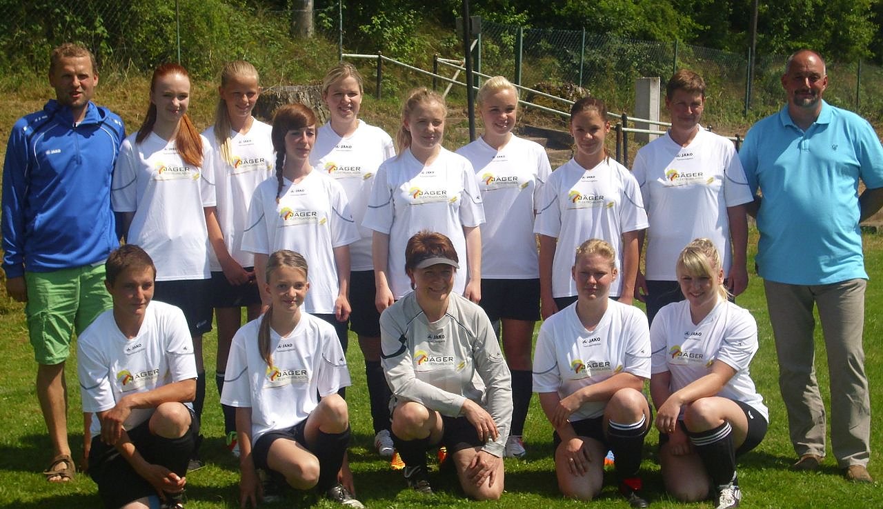 Gesponsert wurde das neue Outfit von der Firma Jäger Elektroanlagen aus dem Ort und zwei anonymen Gönnern. Ein Dank gilt auch dem Verein und dem Jako – Sportgeschäft in Nordhausen. Hinten (v.l.n.r.) Trainer Ingmar Flohr, Klara Nickel, Julia Weise, Julia Czerny, Wibke Flohr, Nina Hartung, Sarah Klement, Friederike Hans, Conny Schüler, Sponsor Dirk Jäger. Vorn (v.l.n.r.) Kathleen Sander, Elisa Nickel, Katja Hartung, Janin Nebelung, Marie Tschirr (es fehlt: Anne Nebelung)